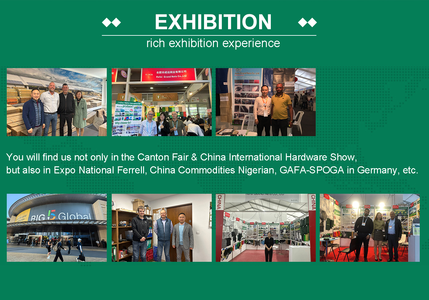 Hefei Grand Nets Co., LTD.Are o istorie de peste 14 ani, principalele produse sunt plasa de umbră, acoperirea solului, plasa de măsline, plasa anti-insecte, plasa pentru păsări etc. Sunt comercializate în întreaga lume, cum ar fi Europa, America, Africa, Asia și Orientul Mijlociu, care acoperă peste 100 de țări și zone.